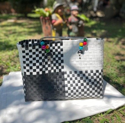 Este bolso tejido a mano con zuncho combina un estilo moderno en blanco y negro con detalles coloridos que lo hacen único. Su patrón de cuadros le da un aire sofisticado y urbano, ideal para quienes aman los accesorios con personalidad.