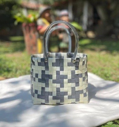 Confeccionado con tiras de zuncho de alta calidad, su diseño entrelazado en tonos blanco y gris le da un toque moderno y versátil que combina con cualquier atuendo.