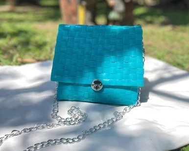 Elegancia y sustentabilidad se combinan en este hermoso bolso tejido artesanalmente con zuncho reciclado. Su vibrante color turquesa aporta frescura y estilo, ideal para quienes buscan destacar con un accesorio original y eco amigable.
